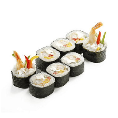 Cream cheese, avocado, cucumber, salmon, sushi rice, nori, pickled ginger, wasabi